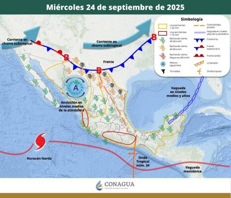 La CEPC explicó que se mantiene en vigilancia la tormenta tropical ”Narda” sobre el Océano Pacífico, la cual se prevé que continúe su trayectoria hacia el oeste-noroeste sin generar efectos directos sobre territorio mexicano.
