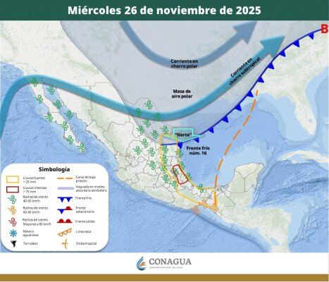 Por otra parte, abundó, un nuevo frente frío se aproximará a la frontera noroeste del país durante sábado próximo, generando rachas de viento fuertes superiores a los 65 kilómetros por hora.