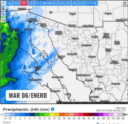 Asimismo, ocasionará un descenso en las temperaturas con valores mínimos que oscilen entre los -5.0 y 0.0 sobre la zona montañosa de Sonora.