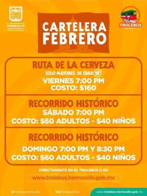 La Dirección de Desarrollo Turístico de la Agencia Municipal de Desarrollo Económico del Ayuntamiento de Hermosillo invita a la ciudadanía a disfrutar de la Cartelera de Febrero del Trolebús, que ofrece recorridos turísticos y experiencias culturales para residentes y visitantes.