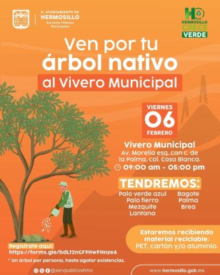 Para fomentar la reforestación urbana y el cuidado del medio ambiente, el Ayuntamiento de Hermosillo a través de Servicios Públicos Municipales y el programa Hermosillo Crece Verde, invita a la ciudadanía a participar en la entrega gratuita de árboles nativos en el Vivero Municipal.