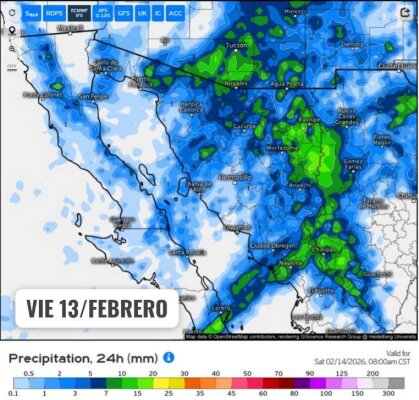El frente frío 34, en combinación con una vaguada polar y las corrientes en chorro polar y subtropical originará cielos mayormente nublados con potencial de lluvias dispersas sobre el norte, noreste, este, sur, así como parte del centro y noroeste de Sonora.
