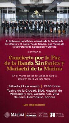 Hermosillo y Guaymas serán sedes de los “Conciertos por la Paz”, evento creado para fortalecer la identidad nacional y la cultura naval, así como la promoción de los valores patrios a través de la disciplina y el talento de los músicos que integran la Banda Sinfónica y Mariachi de la Secretaría de Marina Armada de México (SEMAR).