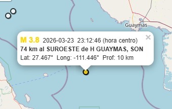 Luego de que el Servicio Sismológico Nacional reportó a las 23:12 horas de ayer un sismo a 74 kilómetros al suroeste de Guaymas de magnitud 3.8, se confirmó que no hubo daños ni reporte de que el movimiento haya sido percibido.