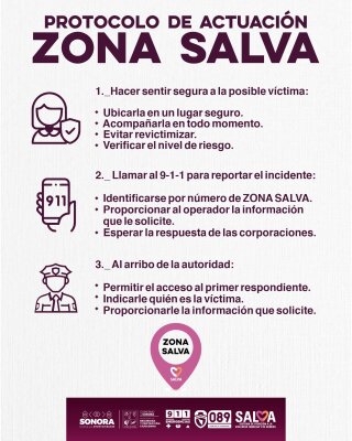 Comprometidos con la seguridad de las mujeres, personal de establecimientos y tiendas de conveniencia —en su mayoría— identificados como Zona SALVA, situados especialmente en Álamos, Bahía de Kino, Hermosillo, Huatabampo, Puerto Peñasco, San Carlos y municipios del Río Sonora, está capacitado para ofrecer resguardo a posibles víctimas de violencia.