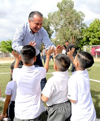 La ilusión de niñas y niños por contar con un espacio digno para jugar futbol en la escuela primaria “Hilarión Santos Sandoval” de la colonia Las Lomas, se hizo realidad con la entrega de una nueva cancha deportiva por parte del alcalde, Antonio Astiazarán Gutiérrez, resultado del trabajo en equipo entre el Ayuntamiento de Hermosillo, comunidad y Gobierno del Estado.