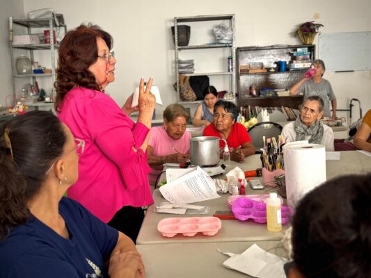 Como parte del programa de Redes de Apoyo para Personas Adultas Mayores y Centros de Cuidado, una de las beneficiarias brinda este taller, donde explica los procesos y asesora paso a paso para crear diferentes diseños de velas.