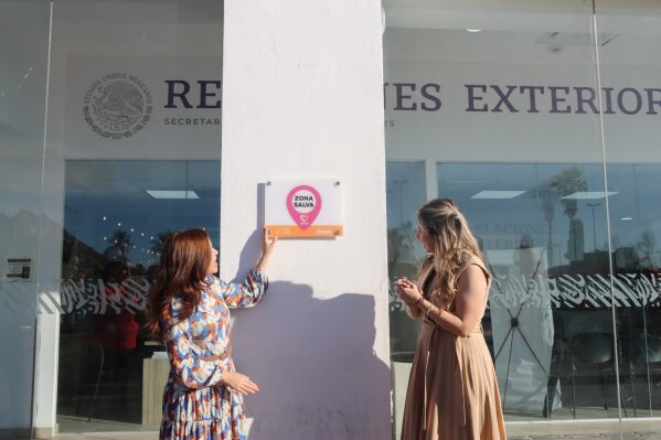 Zulema Boneo Silva, coordinadora estatal del Sistema de Atención a la Violencia Familiar y de Género, junto a Karina Zárate Félix, delegada de la Secretaría de Relaciones Exteriores en Sonora, develaron la placa que identifica las oficinas como un lugar seguro.